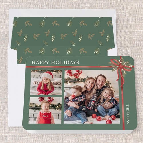 Showcase your beautiful memories with this elegant 3-photo Christmas card, featuring classic holiday floral, botanical and ribbon elements. Add a personal touch with your names and a heartfelt message on the back, or include additional photos to make your greeting even more special. This classic bow Christmas card beautifully ties together your festive cheer and cherished moments.