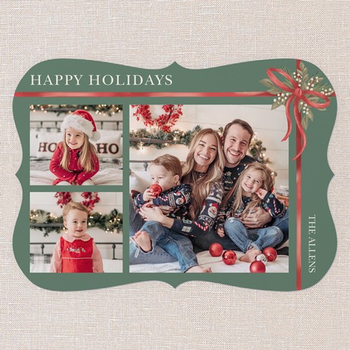 Showcase your beautiful memories with this elegant 3-photo Christmas card, featuring classic holiday floral, botanical and ribbon elements. Add a personal touch with your names and a heartfelt message on the back, or include additional photos to make your greeting even more special. This classic bow Christmas card beautifully ties together your festive cheer and cherished moments.