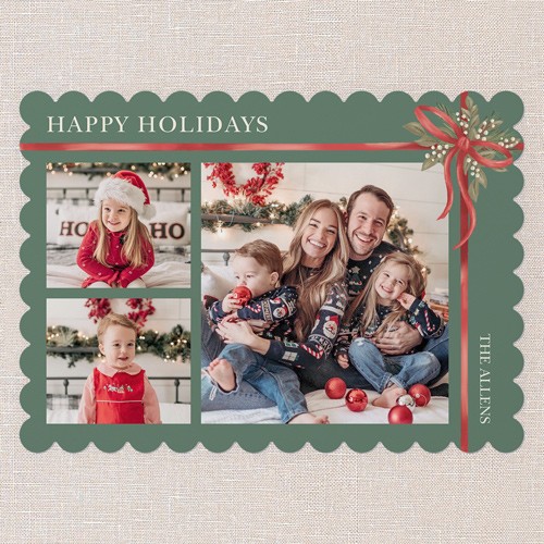 Showcase your beautiful memories with this elegant 3-photo Christmas card, featuring classic holiday floral, botanical and ribbon elements. Add a personal touch with your names and a heartfelt message on the back, or include additional photos to make your greeting even more special. This classic bow Christmas card beautifully ties together your festive cheer and cherished moments.