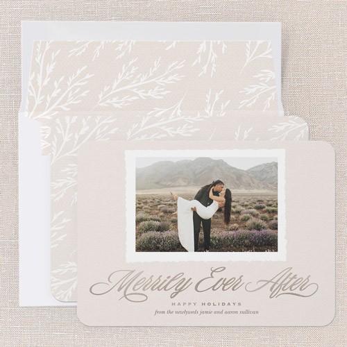Celebrate your first holiday season as a married couple with this classic newlywed Christmas card—it’s the perfect way to share your big day in a big way that friends and family will love. The design features a soft beige background that feels warm and timeless, with elegant script reading “Merrily Ever After” beneath your favorite wedding photo framed in a classic white border with plenty of room to customize to match your style. Customize the “Happy Holidays” greeting and add your names to make it your own. This 5x7-sized newlywed Christmas card is easy to mail and display for a cherished keepsake. Spread joy and celebrate your new chapter together this holiday season.