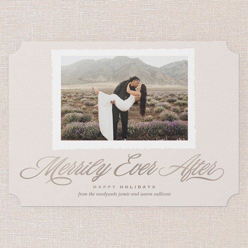 Celebrate your first holiday season as a married couple with this classic newlywed Christmas card—it’s the perfect way to share your big day in a big way that friends and family will love. The design features a soft beige background that feels warm and timeless, with elegant script reading “Merrily Ever After” beneath your favorite wedding photo framed in a classic white border with plenty of room to customize to match your style. Customize the “Happy Holidays” greeting and add your names to make it your own. This 5x7-sized newlywed Christmas card is easy to mail and display for a cherished keepsake. Spread joy and celebrate your new chapter together this holiday season.
