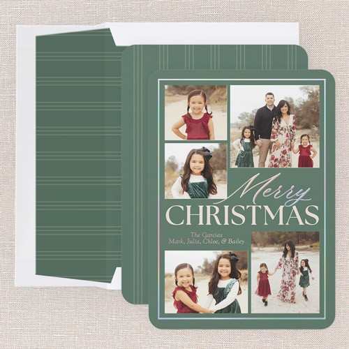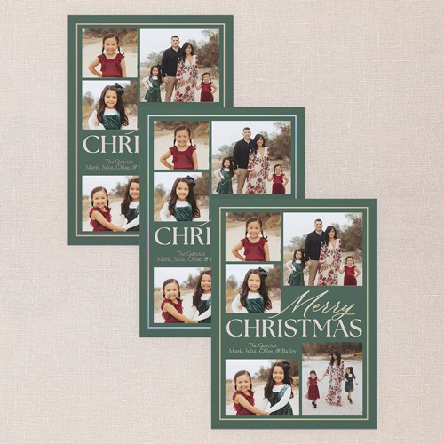 Share even more memories this season with this classic multi photo Christmas card. The design features a timeless border and elegant text, letting your family photos shine. With space for five images, it’s perfect for showing off everyone’s smiles. You can personalize your greeting to say Merry Christmas or Happy Holidays, to match your family’s style and choose from a crisp white or soft green background color, or click the color wheel icon to pick your own to coordinate with your photos. For a touch of shine, print your family name and greeting in personalized foil, including gold foil, rose gold foil, or iridescent foil options. Add more photos and heartfelt messages on the back of this 5x7 card for free to share even more memories.