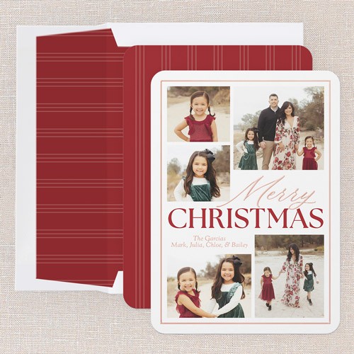 Share even more memories this season with this classic multi photo Christmas card. The design features a timeless border and elegant text, letting your family photos shine. With space for five images, it’s perfect for showing off everyone’s smiles. You can personalize your greeting to say Merry Christmas or Happy Holidays, to match your family’s style and choose from a crisp white or soft green background color, or click the color wheel icon to pick your own to coordinate with your photos. For a touch of shine, print your family name and greeting in personalized foil, including gold foil, rose gold foil, or iridescent foil options. Add more photos and heartfelt messages on the back of this 5x7 card for free to share even more memories.