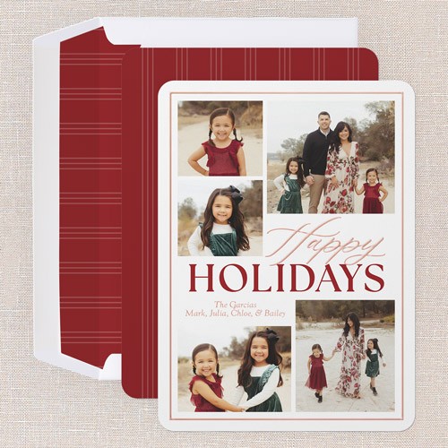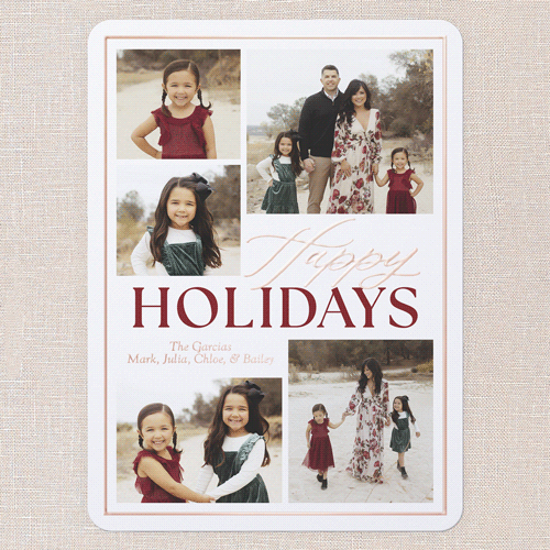 Share even more memories this season with this classic multi photo Christmas card. The design features a timeless border and elegant text, letting your family photos shine. With space for five images, it’s perfect for showing off everyone’s smiles. You can personalize your greeting to say Merry Christmas or Happy Holidays, to match your family’s style and choose from a crisp white or soft green background color, or click the color wheel icon to pick your own to coordinate with your photos. For a touch of shine, print your family name and greeting in personalized foil, including gold foil, rose gold foil, or iridescent foil options. Add more photos and heartfelt messages on the back of this 5x7 card for free to share even more memories.