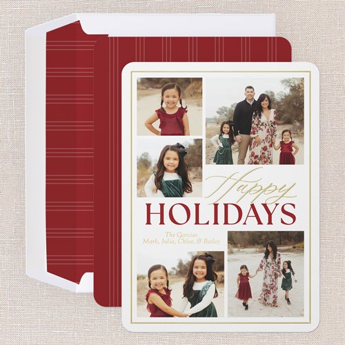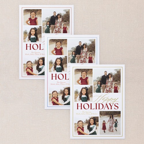 Share even more memories this season with this classic multi photo Christmas card. The design features a timeless border and elegant text, letting your family photos shine. With space for five images, it’s perfect for showing off everyone’s smiles. You can personalize your greeting to say Merry Christmas or Happy Holidays, to match your family’s style and choose from a crisp white or soft green background color, or click the color wheel icon to pick your own to coordinate with your photos. For a touch of shine, print your family name and greeting in personalized foil, including gold foil, rose gold foil, or iridescent foil options. Add more photos and heartfelt messages on the back of this 5x7 card for free to share even more memories.