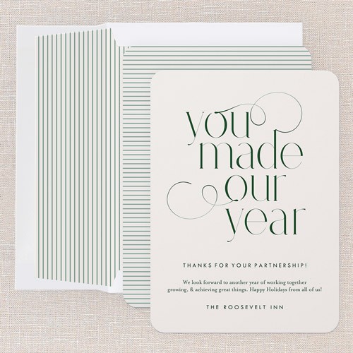 Send a holiday card that truly stands out with this classic typography Christmas card designed especially for businesses. Elegant typography in the greeting “You made our year,” makes it a thoughtful choice for company Christmas cards or corporate holiday cards. The non-photo card features a sleek background that you can personalize in deep blue, soft gray, or click the color wheel icon to pick a color that reflects your brand or style. The 5x7 size offers plenty of space for your custom message, perfect for expressing gratitude to clients, customers, and employees. Show your appreciation and send season’s greetings with a business holiday card that feels both personal and professional.
