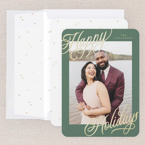 Celebrate the season with this classic holiday card, designed to showcase your favorite photo in a timeless way. Elegant typography frames your photo beautifully in your choice of: Merry Christmas, Happy Holidays, Christmas Blessings, or Feliz Navidad greeting in stunning foil, adding a festive touch to your Christmas card. Plus, add your family name in real foil, with options for gold foil, rose gold foil, or iridescent foil for a little extra sparkle. Choose from a clean white, soft green, or sleek black background color, or click the color wheel to choose your own color to coordinate with your photo. Sized at 5x7, this personalized foil Christmas card is a warm, classic way to send love to friends and family this year.