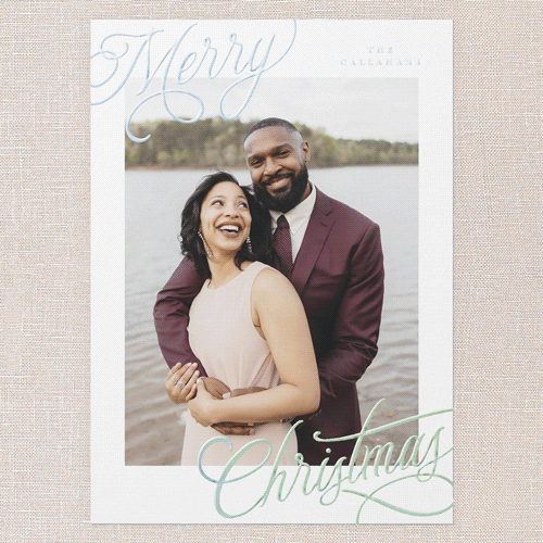 Celebrate the season with this classic holiday card, designed to showcase your favorite photo in a timeless way. Elegant typography frames your photo beautifully in your choice of: Merry Christmas, Happy Holidays, Christmas Blessings, or Feliz Navidad greeting in stunning foil, adding a festive touch to your Christmas card. Plus, add your family name in real foil, with options for gold foil, rose gold foil, or iridescent foil for a little extra sparkle. Choose from a clean white, soft green, or sleek black background color, or click the color wheel to choose your own color to coordinate with your photo. Sized at 5x7, this personalized foil Christmas card is a warm, classic way to send love to friends and family this year.