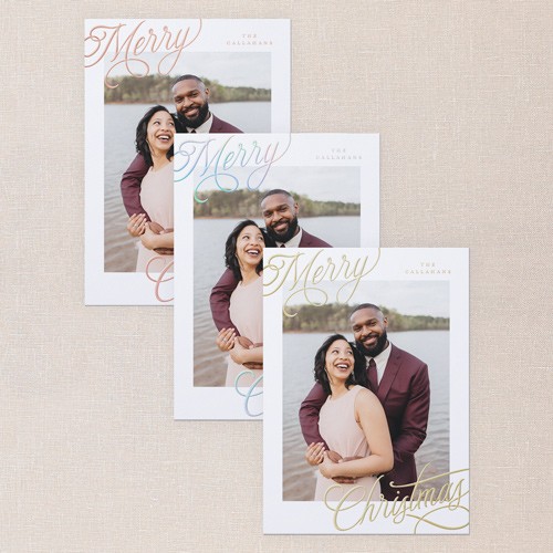 Celebrate the season with this classic holiday card, designed to showcase your favorite photo in a timeless way. Elegant typography frames your photo beautifully in your choice of: Merry Christmas, Happy Holidays, Christmas Blessings, or Feliz Navidad greeting in stunning foil, adding a festive touch to your Christmas card. Plus, add your family name in real foil, with options for gold foil, rose gold foil, or iridescent foil for a little extra sparkle. Choose from a clean white, soft green, or sleek black background color, or click the color wheel to choose your own color to coordinate with your photo. Sized at 5x7, this personalized foil Christmas card is a warm, classic way to send love to friends and family this year.