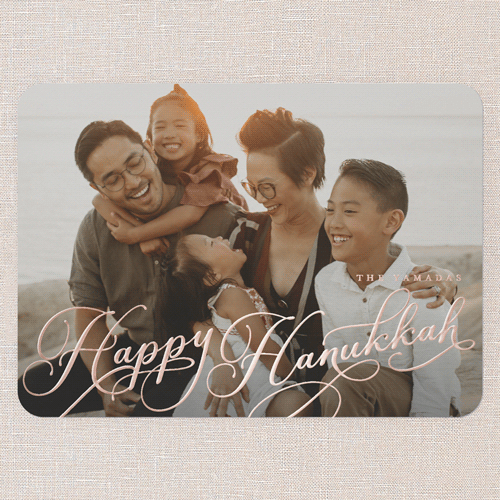 Send season's greetings with a classic holiday card that puts your favorite family photo front and center. This full photo card features elegant typography with graceful script in your choice of greeting, including: Merry Christmas, Happy Holidays, Happy New Year, Simply Blessed, or Happy Hanukkah to match your family’s traditions. The design is simple, timeless, and perfect for sharing a heartfelt moment with loved ones. Personalize your card with real foil details—choose from rose gold foil, iridescent foil, or gold foil to make your greeting and family name shine. Available in a 5x7 size, this one photo holiday card is a beautiful way to send warm wishes. Add more photos and text on the back for free to make your card truly unique.