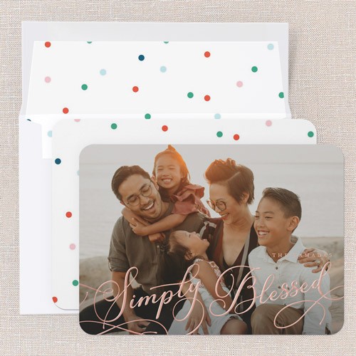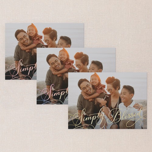 Send season's greetings with a classic holiday card that puts your favorite family photo front and center. This full photo card features elegant typography with graceful script in your choice of greeting, including: Merry Christmas, Happy Holidays, Happy New Year, Simply Blessed, or Happy Hanukkah to match your family’s traditions. The design is simple, timeless, and perfect for sharing a heartfelt moment with loved ones. Personalize your card with real foil details—choose from rose gold foil, iridescent foil, or gold foil to make your greeting and family name shine. Available in a 5x7 size, this one photo holiday card is a beautiful way to send warm wishes. Add more photos and text on the back for free to make your card truly unique.