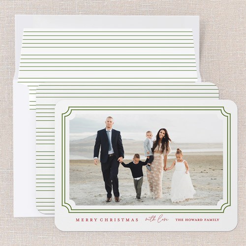 Share your favorite family moment with this classic holiday card. The design features a timeless border with elegant white accents framing your photo for a truly special touch. This one photo Christmas card lets your memories shine, making it perfect for sharing a cherished memory with friends and family. Customize the background color with a classic blue, crisp white, or use click the color wheel icon to pick a shade that matches your photo and style. Personalize your greeting and add your family name for an extra thoughtful detail. Sized at 5x7, it’s just right for mailing or displaying.