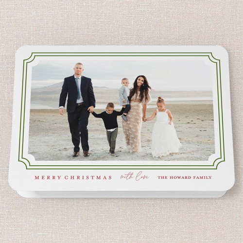 Share your favorite family moment with this classic holiday card. The design features a timeless border with elegant white accents framing your photo for a truly special touch. This one photo Christmas card lets your memories shine, making it perfect for sharing a cherished memory with friends and family. Customize the background color with a classic blue, crisp white, or use click the color wheel icon to pick a shade that matches your photo and style. Personalize your greeting and add your family name for an extra thoughtful detail. Sized at 5x7, it’s just right for mailing or displaying.