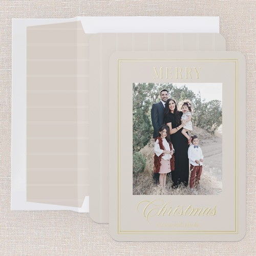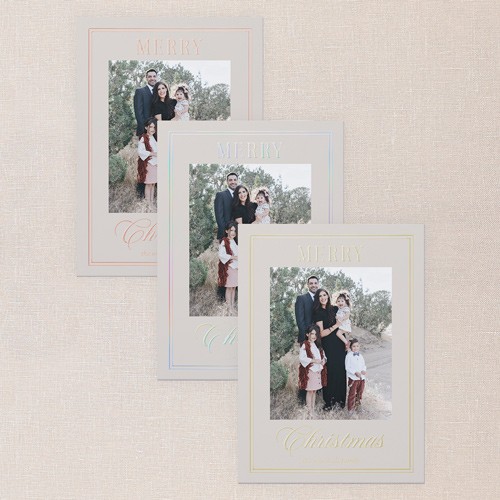 Share your holiday cheer with this classic holiday card. The design has a traditional Christmas card feel with your photo taking center stage, framed beautifully by a clean border and a sophisticated style script that reads “Merry Christmas” or "Happy Holidays" depending on your preference. Personalize your greeting and family name in real foil for an extra special touch—choose from gold foil, rose gold foil, or iridescent foil. You can also switch up the background color with a deep red, warm beige, wintery blue, or click the color wheel icon to choose your own color to complement your photo perfectly. This 5x7 one photo Christmas card is perfect for sharing a heartfelt moment with loved ones.