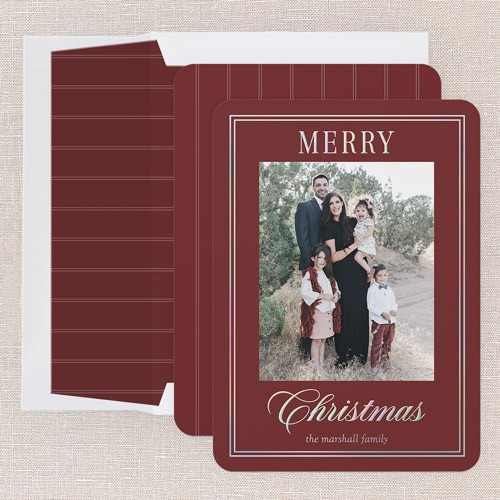 Share your holiday cheer with this classic holiday card. The design has a traditional Christmas card feel with your photo taking center stage, framed beautifully by a clean border and a sophisticated style script that reads “Merry Christmas” or "Happy Holidays" depending on your preference. Personalize your greeting and family name in real foil for an extra special touch—choose from gold foil, rose gold foil, or iridescent foil. You can also switch up the background color with a deep red, warm beige, wintery blue, or click the color wheel icon to choose your own color to complement your photo perfectly. This 5x7 one photo Christmas card is perfect for sharing a heartfelt moment with loved ones.