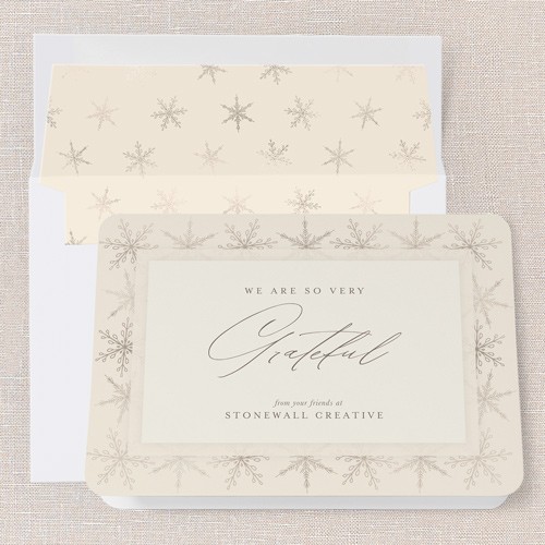Share your appreciation this season with a classic holiday card that’s perfect for businesses. This iconic company Christmas card design features a timeless beige background with delicate snowflake accents, creating a warm and inviting look. The elegant script in the center reads “We Are So Very Grateful,” making it a thoughtful choice for sending holiday greetings to clients, colleagues, and loved ones. This card is designed to be a non-photo holiday card, so it’s easy to personalize with your company name or family message. You can choose to switch up the background color by clicking the color wheel icon—great for coordinating with your brand or personal style. Sized at 5x7, this business Christmas card is a simple yet meaningful way to connect and show gratitude during the holidays. Send a holiday card that truly stands out this year.