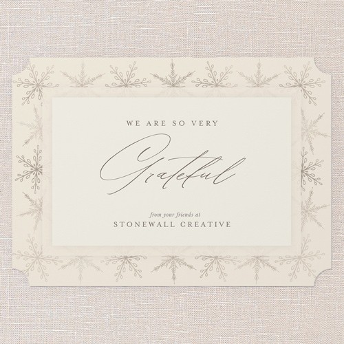 Share your appreciation this season with a classic holiday card that’s perfect for businesses. This iconic company Christmas card design features a timeless beige background with delicate snowflake accents, creating a warm and inviting look. The elegant script in the center reads “We Are So Very Grateful,” making it a thoughtful choice for sending holiday greetings to clients, colleagues, and loved ones. This card is designed to be a non-photo holiday card, so it’s easy to personalize with your company name or family message. You can choose to switch up the background color by clicking the color wheel icon—great for coordinating with your brand or personal style. Sized at 5x7, this business Christmas card is a simple yet meaningful way to connect and show gratitude during the holidays. Send a holiday card that truly stands out this year.