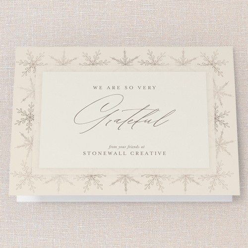 Share your appreciation this season with a classic holiday card that’s perfect for businesses. This iconic company Christmas card design features a timeless beige background with delicate snowflake accents, creating a warm and inviting look. The elegant script in the center reads “We Are So Very Grateful,” making it a thoughtful choice for sending holiday greetings to clients, colleagues, and loved ones. This card is designed to be a non-photo holiday card, so it’s easy to personalize with your company name or family message. You can choose to switch up the background color by clicking the color wheel icon—great for coordinating with your brand or personal style. Sized at 5x7, this business Christmas card is a simple yet meaningful way to connect and show gratitude during the holidays. Send a holiday card that truly stands out this year.