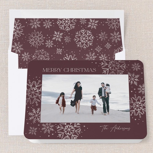 Celebrate the season with a classic holiday card that’s all about timeless style. This iconic Christmas card features a rich background with delicate snowflake illustrations, giving it a wintery look that feels festive and elegant. The design lets up to three of your favorite family photos shine in the center to showcase your memories. The greeting “Merry Christmas” is in beautiful festive lettering and space to add your family name for a thoughtful touch. Choose from beautiful background colors, including deep purple, or blue, or click the color wheel icon to choose your own to match your photo perfectly. Sized at 5x7, this charming Christmas card is a classic design that’s sure to be cherished.