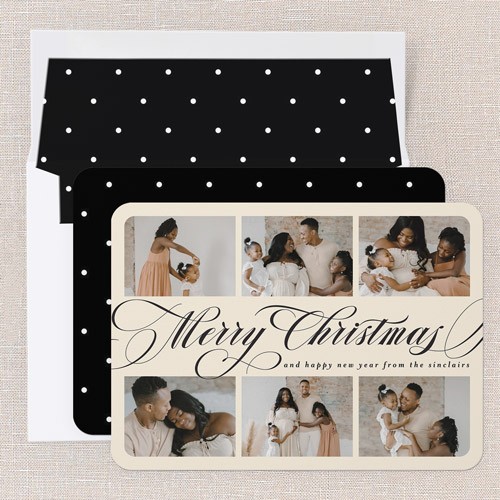 Share even more memories this season with this classic, typography holiday card. The design features a beautiful photo collage layout, perfect for families who want to showcase several moments. Choose from “Merry Christmas” or "Happy Holidays" across the front in elegant cursive text with space to add your family name. You can personalize this multi photo Christmas card with up to six photos, making it a wonderful way to share your life with loved ones. Choose from a festive red, rich green, or warm beige background color, or click the color wheel icon to coordinate the background with your photos. This personalized foil Christmas card lets you add your text in real foil, available in gold foil, rose gold foil, or iridescent foil for a touch of shine. Sized at 5x7, it’s easy to customize and makes sending holiday cheer simple and meaningful.