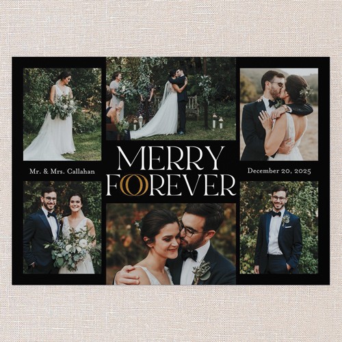 Celebrate your first holiday season as newlyweds with this classic multi photo Christmas card. Share your favorite wedding moments with space for six photos so you can highlight everything from your big day to candid smiles. The charming “Merry Forever” greeting incorporates two wedding ring icons in the lettering to add an extra festive touch. The elegant black background gives your holiday card a timeless look, or you can easily switch it up—just click the color wheel icon to choose your own background color and coordinate with your photos. Personalize your card with your names and wedding date for a truly special touch. Sized at 5x7, this newlywed Christmas card is a heartfelt way to send love and joy to friends and family. Make your holiday card as unique as your love story and let your wedding memories shine this Christmas.