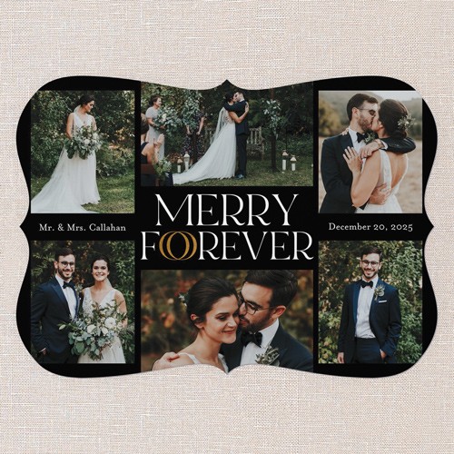 Celebrate your first holiday season as newlyweds with this classic multi photo Christmas card. Share your favorite wedding moments with space for six photos so you can highlight everything from your big day to candid smiles. The charming “Merry Forever” greeting incorporates two wedding ring icons in the lettering to add an extra festive touch. The elegant black background gives your holiday card a timeless look, or you can easily switch it up—just click the color wheel icon to choose your own background color and coordinate with your photos. Personalize your card with your names and wedding date for a truly special touch. Sized at 5x7, this newlywed Christmas card is a heartfelt way to send love and joy to friends and family. Make your holiday card as unique as your love story and let your wedding memories shine this Christmas.