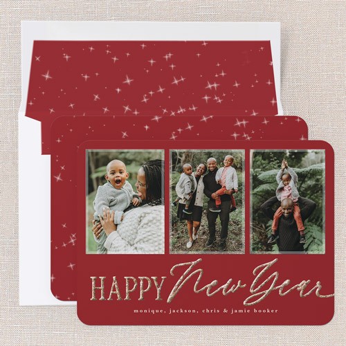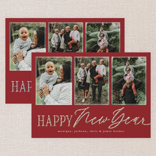 Celebrate the season with this classic holiday card, designed to showcase your favorite family moments. The card features a rich red background and a multi photo layout, perfect for sharing three special snapshots from your year. The “Happy Holidays” greeting sparkles in real gold or silver glitter, adding a festive touch that truly shines—without any mess. You can easily customize the background color to match your photos, thanks to the dynamic color option. Just click the color wheel icon to pick your favorite shade, or stick with timeless red or crisp white. Whether you’re sending a Christmas card or a holiday card, this design lets you personalize your message and family name for a warm, personal touch. Make your holiday greetings extra memorable with a card that’s as joyful and classic as your family traditions.