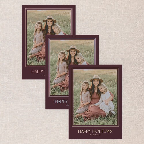 Share your favorite family moment with this classic Christmas card. The design features a full-bleed photo framed by a clean white border, giving it a timeless and elegant look. Your choice of “Merry Christmas” or "Happy Holidays" is printed in a modern font, making it perfect for sending warm holiday wishes to friends and family. You can personalize this one photo holiday card with your family name and greeting in real foil, available in gold foil, rose gold foil, or iridescent foil for a touch of festive shine. Choose from background options in holiday red, crisp white, or click the color wheel icon to choose your own background color to match your card to your photo’s palette. Sized at 5x7, this card is easy to customize and makes a beautiful keepsake. Make your holiday card stand out with a personal touch and a little sparkle this season.