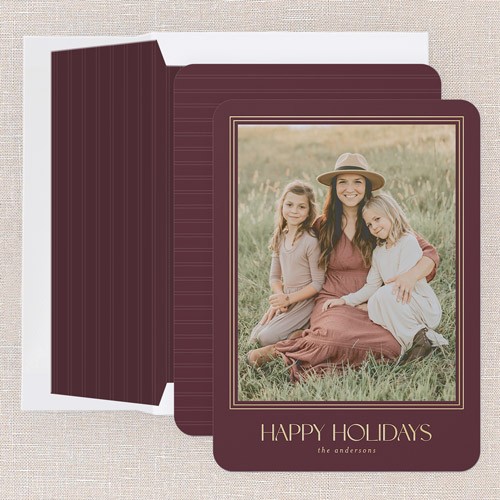 Share your favorite family moment with this classic Christmas card. The design features a full-bleed photo framed by a clean white border, giving it a timeless and elegant look. Your choice of “Merry Christmas” or "Happy Holidays" is printed in a modern font, making it perfect for sending warm holiday wishes to friends and family. You can personalize this one photo holiday card with your family name and greeting in real foil, available in gold foil, rose gold foil, or iridescent foil for a touch of festive shine. Choose from background options in holiday red, crisp white, or click the color wheel icon to choose your own background color to match your card to your photo’s palette. Sized at 5x7, this card is easy to customize and makes a beautiful keepsake. Make your holiday card stand out with a personal touch and a little sparkle this season.