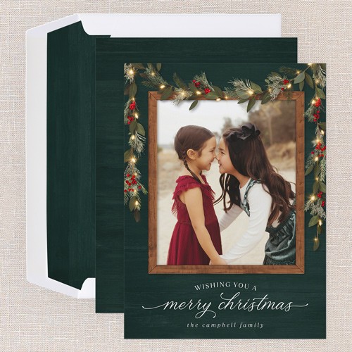 Celebrate the season with this rustic botanical holiday card, featuring a classic Christmas design that feels warm and inviting. The wood-tone background and festive greenery frame up to three of your favorite family photos, making it a truly iconic Christmas card. Personalize your greeting with options like “Wishing You a Merry Christmas,” “Wishing You Happy Holidays,” or “Wishing You a Blessed Christmas” to suit your style. You can choose from a range of background colors including white, red, green, brown, and blue to coordinate perfectly with your photos. This personalized foil Christmas card lets you add your family name and greeting in real foil, available in gold foil, rose gold foil, or iridescent foil for a touch of shimmer. Available in a 6x8 size, you can add more photos and text on the back for free. Send a holiday card that’s classic, heartfelt, and uniquely yours!