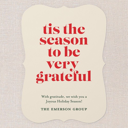 Send a holiday card that’s both classic and heartfelt. This business Christmas card features a clean, modern design with bold red lettering on a soft beige background, making it perfect for sharing gratitude with clients, colleagues, and employees. The message, “’tis the season to be very grateful,” sets a warm tone for your holiday greeting. As a non-photo card, it’s easy to personalize with your company name and a custom message. You can choose the background in neutral beige or click the color wheel icon to select your own background color—great for matching your brand or personal preference. Sized at 5x7, this holiday card is just right for sending thoughtful company Christmas cards that stand out.