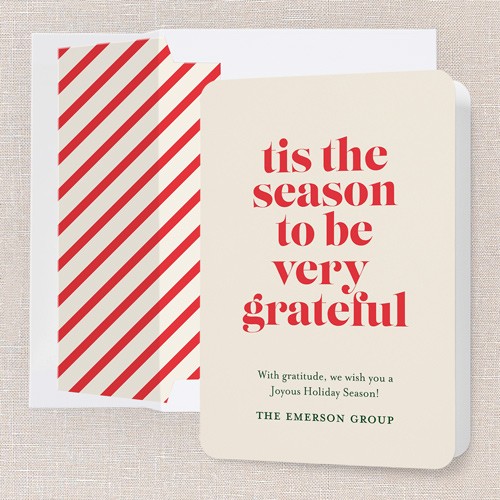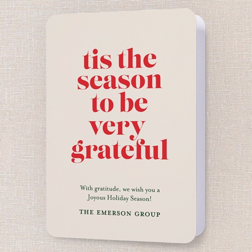 Send a holiday card that’s both classic and heartfelt. This business Christmas card features a clean, modern design with bold red lettering on a soft beige background, making it perfect for sharing gratitude with clients, colleagues, and employees. The message, “’tis the season to be very grateful,” sets a warm tone for your holiday greeting. As a non-photo card, it’s easy to personalize with your company name and a custom message. You can choose the background in neutral beige or click the color wheel icon to select your own background color—great for matching your brand or personal preference. Sized at 5x7, this holiday card is just right for sending thoughtful company Christmas cards that stand out.