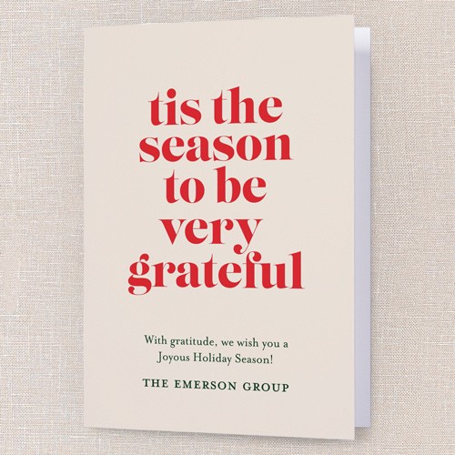 Send a holiday card that’s both classic and heartfelt. This business Christmas card features a clean, modern design with bold red lettering on a soft beige background, making it perfect for sharing gratitude with clients, colleagues, and employees. The message, “’tis the season to be very grateful,” sets a warm tone for your holiday greeting. As a non-photo card, it’s easy to personalize with your company name and a custom message. You can choose the background in neutral beige or click the color wheel icon to select your own background color—great for matching your brand or personal preference. Sized at 5x7, this holiday card is just right for sending thoughtful company Christmas cards that stand out.