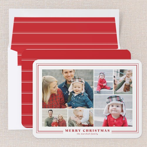 Share all your favorite moments with this classic multi photo Christmas card. The timeless design features a clean background with a thin border, giving it a polished look that’s perfect for the season. With space for several photos, this photo collage holiday card lets you showcase everything from family portraits to candid snapshots—ideal for sharing the highlights of your year. The greeting reads “Merry Christmas,” and you can personalize the card with your family name for an extra special touch. Choose from a holiday red or deep blue background, or click the color wheel icon to select your own color, making it easy to coordinate with your photos. Sized at 5x7, this holiday card is just right for mailing and displaying. Make your Christmas card stand out and send a little extra joy to everyone on your list.