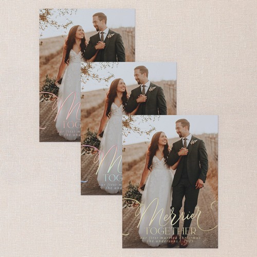 Celebrate your first holiday season as newlyweds with this classic, full photo Christmas card. Feature your favorite wedding photo front and center, with elegant script that reads “Merrier Together”—perfect for sharing your joy with friends and family. Personalize the card with your names and greeting in real foil, available in gold foil, rose gold foil, or iridescent foil for a touch of sparkle. This 5x7 holiday card is easy to customize, and you can add more photos or a heartfelt message on the back for free. This design is a beautiful way to share your love and happy news this season.
