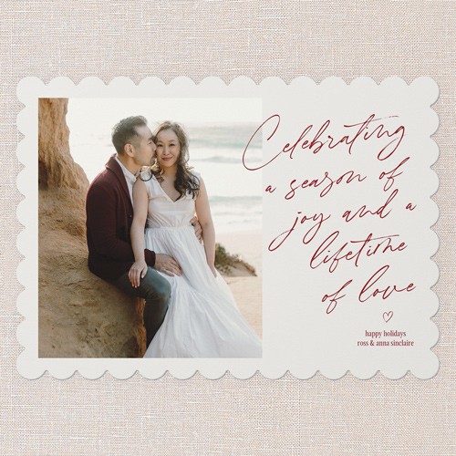 Celebrate your first holiday season as a married couple with this classic newlywed Christmas card. The design features a soft grey background to complement any photo with the elegant greeting, “Celebrating a season of joy and a lifetime of love,” perfect for sharing with your favorite wedding photo. You can easily customize the background color by clicking the color wheel icon to choose any shade that matches your style. This 5x7 holiday card is a beautiful way to send your season's greetings and showcase your big day. Add your names and a personal message to make it truly yours and start new traditions together.