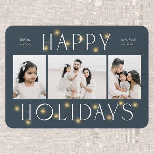 Celebrate the season with this classic holiday card featuring an iconic Christmas design. The card showcases a timeless multi photo layout, perfect for sharing your favorite family moments. The elegant greeting of your choice is displayed in a crisp, modern font, surrounded by soft, glowing lights for an extra festive touch. Choose from the greetings: Merry Christmas, Happy Holidays, or Feliz Navidad to match your family's traditions. Personalize your design by adding your family's names and choose from a deep blue background with warm yellow lights or multicolored lights. Click the color wheel icon to select your own background color—great for coordinating with your photos. Available in a 6x8 size, you can add more photos or text on the back for free. This classic family Christmas card is a warm, personal way to connect with loved ones this year.