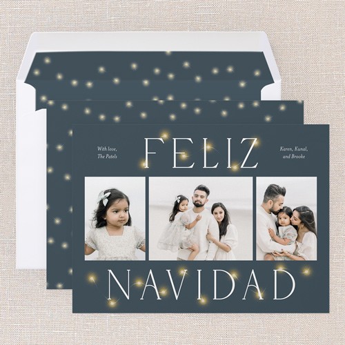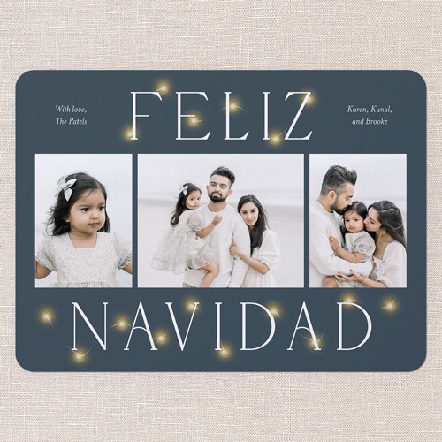 Celebrate the season with this classic holiday card featuring an iconic Christmas design. The card showcases a timeless multi photo layout, perfect for sharing your favorite family moments. The elegant greeting of your choice is displayed in a crisp, modern font, surrounded by soft, glowing lights for an extra festive touch. Choose from the greetings: Merry Christmas, Happy Holidays, or Feliz Navidad to match your family's traditions. Personalize your design by adding your family's names and choose from a deep blue background with warm yellow lights or multicolored lights. Click the color wheel icon to select your own background color—great for coordinating with your photos. Available in a 6x8 size, you can add more photos or text on the back for free. This classic family Christmas card is a warm, personal way to connect with loved ones this year.