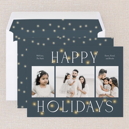 Celebrate the season with this classic holiday card featuring an iconic Christmas design. The card showcases a timeless multi photo layout, perfect for sharing your favorite family moments. The elegant greeting of your choice is displayed in a crisp, modern font, surrounded by soft, glowing lights for an extra festive touch. Choose from the greetings: Merry Christmas, Happy Holidays, or Feliz Navidad to match your family's traditions. Personalize your design by adding your family's names and choose from a deep blue background with warm yellow lights or multicolored lights. Click the color wheel icon to select your own background color—great for coordinating with your photos. Available in a 6x8 size, you can add more photos or text on the back for free. This classic family Christmas card is a warm, personal way to connect with loved ones this year.