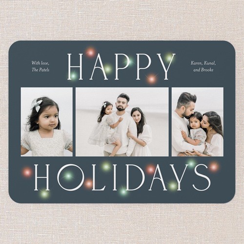Celebrate the season with this classic holiday card featuring an iconic Christmas design. The card showcases a timeless multi photo layout, perfect for sharing your favorite family moments. The elegant greeting of your choice is displayed in a crisp, modern font, surrounded by soft, glowing lights for an extra festive touch. Choose from the greetings: Merry Christmas, Happy Holidays, or Feliz Navidad to match your family's traditions. Personalize your design by adding your family's names and choose from a deep blue background with warm yellow lights or multicolored lights. Click the color wheel icon to select your own background color—great for coordinating with your photos. Available in a 6x8 size, you can add more photos or text on the back for free. This classic family Christmas card is a warm, personal way to connect with loved ones this year.