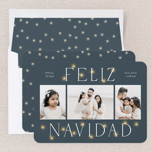 Celebrate the season with this classic holiday card featuring an iconic Christmas design. The card showcases a timeless multi photo layout, perfect for sharing your favorite family moments. The elegant greeting of your choice is displayed in a crisp, modern font, surrounded by soft, glowing lights for an extra festive touch. Choose from the greetings: Merry Christmas, Happy Holidays, or Feliz Navidad to match your family's traditions. Personalize your design by adding your family's names and choose from a deep blue background with warm yellow lights or multicolored lights. Click the color wheel icon to select your own background color—great for coordinating with your photos. Available in a 6x8 size, you can add more photos or text on the back for free. This classic family Christmas card is a warm, personal way to connect with loved ones this year.