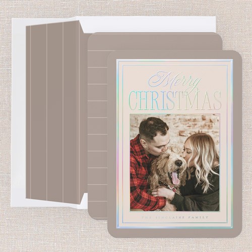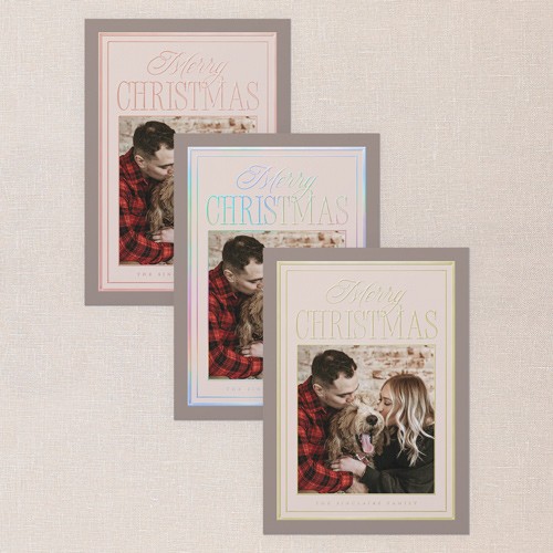 Celebrate the season with this classic holiday card, designed to showcase your favorite family photo front and center. The elegant borders and timeless “Happy Holidays” or “Merry Christmas" greeting of your choice make it easy to send your warm wishes to loved ones in a timeless style. This personalized foil Christmas card lets you add your family name and greeting in real foil, available in gold foil, rose gold foil, or iridescent foil for a touch of extra sparkle. Personalize the background border with your choice of a classic green, festive red, and warm beige, or click the color wheel icon to choose your own color to coordinate with your photo. Sized at 5x7, this Christmas card is easy to customize to share your family’s joy with loved one's near or far this season.
