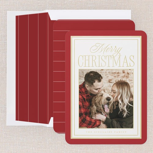 Celebrate the season with this classic holiday card, designed to showcase your favorite family photo front and center. The elegant borders and timeless “Happy Holidays” or “Merry Christmas" greeting of your choice make it easy to send your warm wishes to loved ones in a timeless style. This personalized foil Christmas card lets you add your family name and greeting in real foil, available in gold foil, rose gold foil, or iridescent foil for a touch of extra sparkle. Personalize the background border with your choice of a classic green, festive red, and warm beige, or click the color wheel icon to choose your own color to coordinate with your photo. Sized at 5x7, this Christmas card is easy to customize to share your family’s joy with loved one's near or far this season.