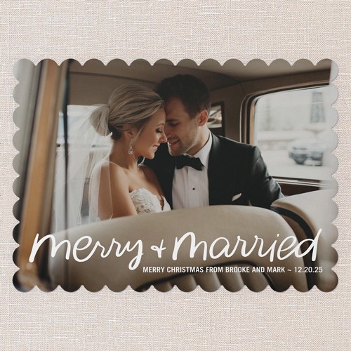 Celebrate your first holiday season as newlyweds with this classic “merry & married” Christmas card. The full photo design lets your favorite wedding moment take center stage, making it a perfect one photo holiday card for couples who want to share their big day in a big way. The elegant script reads “Merry Christmas from [your names],” and you can personalize the date for an extra special touch. Choose from a crisp white background or click the color wheel icon to select your own background color, so your card coordinates beautifully with your photo. Sized at 5x7, this newlywed Christmas card is easy to customize and makes a heartfelt keepsake for friends and family. Share your joy and newlywed glow with a holiday card that’s as personal and warm as your love story.