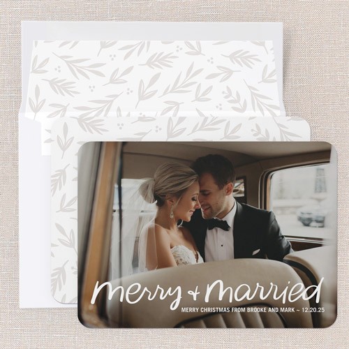 Celebrate your first holiday season as newlyweds with this classic “merry & married” Christmas card. The full photo design lets your favorite wedding moment take center stage, making it a perfect one photo holiday card for couples who want to share their big day in a big way. The elegant script reads “Merry Christmas from [your names],” and you can personalize the date for an extra special touch. Choose from a crisp white background or click the color wheel icon to select your own background color, so your card coordinates beautifully with your photo. Sized at 5x7, this newlywed Christmas card is easy to customize and makes a heartfelt keepsake for friends and family. Share your joy and newlywed glow with a holiday card that’s as personal and warm as your love story.