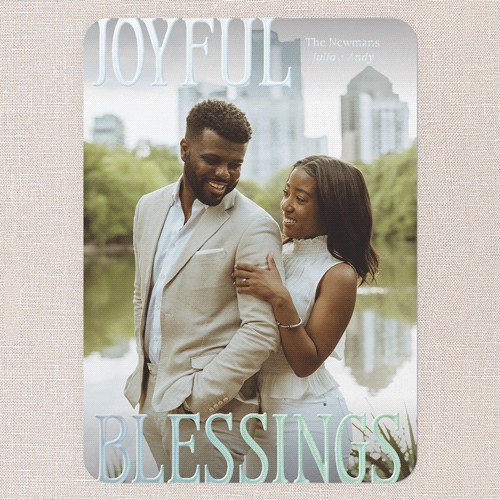 Celebrate the season with a classic holiday card featuring a full photo design. Let a special moment take center stage with this one photo card, perfect for sharing with friends and family. The elegant white background keeps things timeless and fresh, while your choice of: Merry Christmas, Happy Holidays, Happy New Year, Joyful Blessings, and Feliz Navidad greeting to make it truly yours. Personalize your card with real foil details to make it extra special—choose from gold foil, rose gold foil, or iridescent foil for a little extra sparkle. Add more photos and text on the back for free, so you can share even more joy. This personalized foil Christmas card is available in a 5x7 size, making it easy to display or mail to friends and family near and far.
