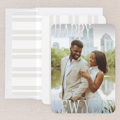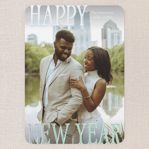 Celebrate the season with a classic holiday card featuring a full photo design. Let a special moment take center stage with this one photo card, perfect for sharing with friends and family. The elegant white background keeps things timeless and fresh, while your choice of: Merry Christmas, Happy Holidays, Happy New Year, Joyful Blessings, and Feliz Navidad greeting to make it truly yours. Personalize your card with real foil details to make it extra special—choose from gold foil, rose gold foil, or iridescent foil for a little extra sparkle. Add more photos and text on the back for free, so you can share even more joy. This personalized foil Christmas card is available in a 5x7 size, making it easy to display or mail to friends and family near and far.