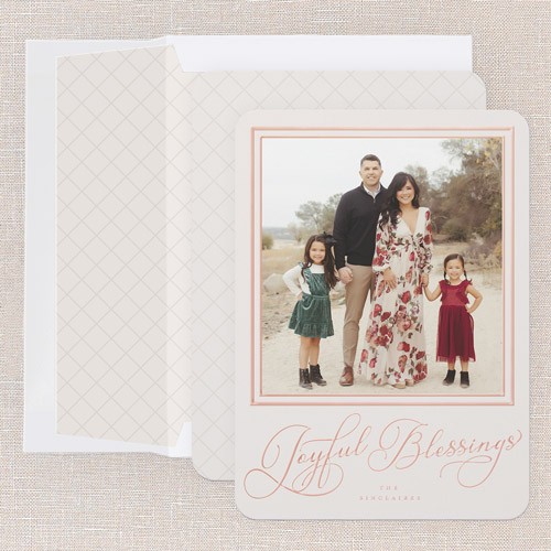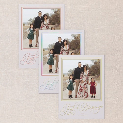 Share your favorite family moment with this classic holiday card. The design features elegant typography with your choice of greetings, including: Merry Christmas, Happy Holiday, or Joyful Blessings, paired with a full photo layout—perfect for letting one special picture shine. The border adds a timeless touch framing your photos, with options to adjust the background color to a rich green or soft gray, or click the color wheel icon to choose your own background color for a truly custom look. This personalized foil Christmas card lets you add your family name and greeting in real foil, available in gold foil, rose gold foil, and iridescent foil for an elegant touch. Sized at 5x7, it’s just right for sharing with friends and family near and far.