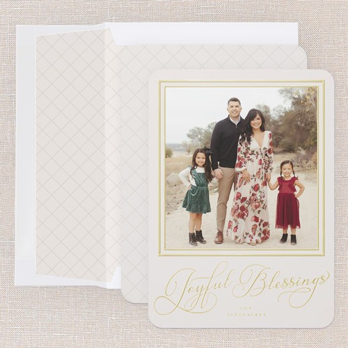 Share your favorite family moment with this classic holiday card. The design features elegant typography with your choice of greetings, including: Merry Christmas, Happy Holiday, or Joyful Blessings, paired with a full photo layout—perfect for letting one special picture shine. The border adds a timeless touch framing your photos, with options to adjust the background color to a rich green or soft gray, or click the color wheel icon to choose your own background color for a truly custom look. This personalized foil Christmas card lets you add your family name and greeting in real foil, available in gold foil, rose gold foil, and iridescent foil for an elegant touch. Sized at 5x7, it’s just right for sharing with friends and family near and far.