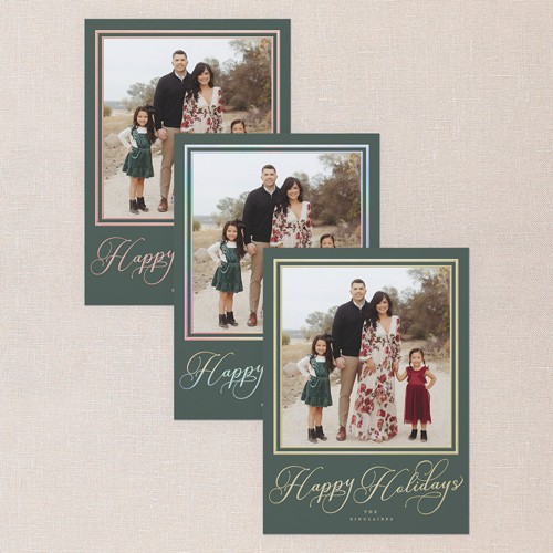 Share your favorite family moment with this classic holiday card. The design features elegant typography with your choice of greetings, including: Merry Christmas, Happy Holiday, or Joyful Blessings, paired with a full photo layout—perfect for letting one special picture shine. The border adds a timeless touch framing your photos, with options to adjust the background color to a rich green or soft gray, or click the color wheel icon to choose your own background color for a truly custom look. This personalized foil Christmas card lets you add your family name and greeting in real foil, available in gold foil, rose gold foil, and iridescent foil for an elegant touch. Sized at 5x7, it’s just right for sharing with friends and family near and far.